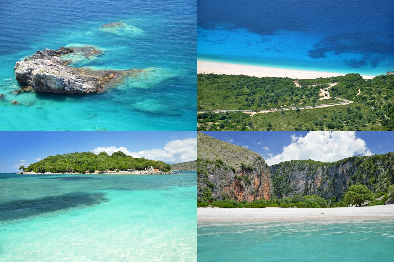 From top left: Jale beach, view from Llogara Pass, Ksamil beach and Ghipe beach
